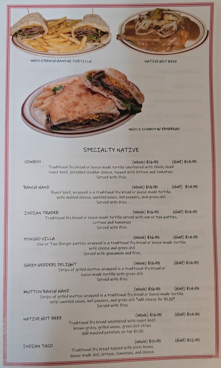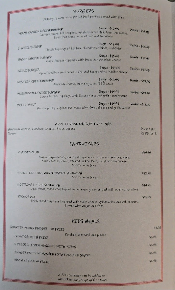 Burger selections range from classic to more customized options. Choices include a Classic Burger with standard toppings, a Bacon Cheese Burger, the Keams Canyon Cheeseburger featuring sautéed onions, bell peppers, diced green chili, and American cheese with honey hot sauce, as well as a Chili Burger served open-faced with chili and cheddar cheese. These entries offer filling options suitable for lunch or casual dining.